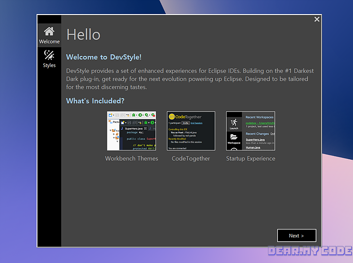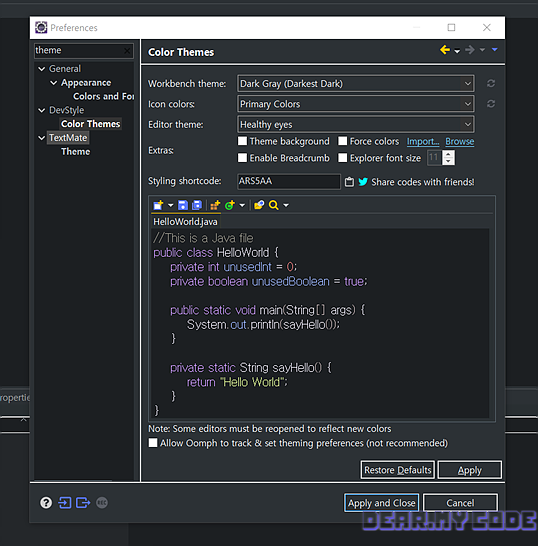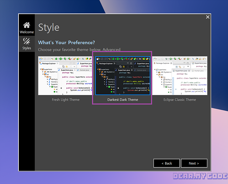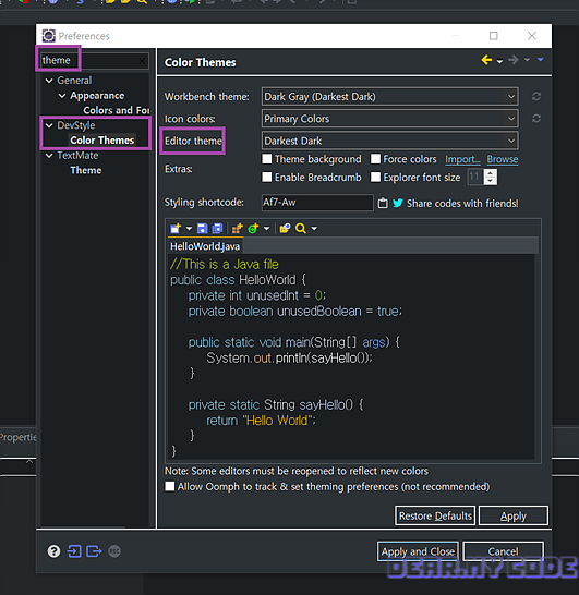 설치가 완료되면 이클립스가 재시작되고, 런처에서 중간의 darkest dark theme를 선택하면 된다.