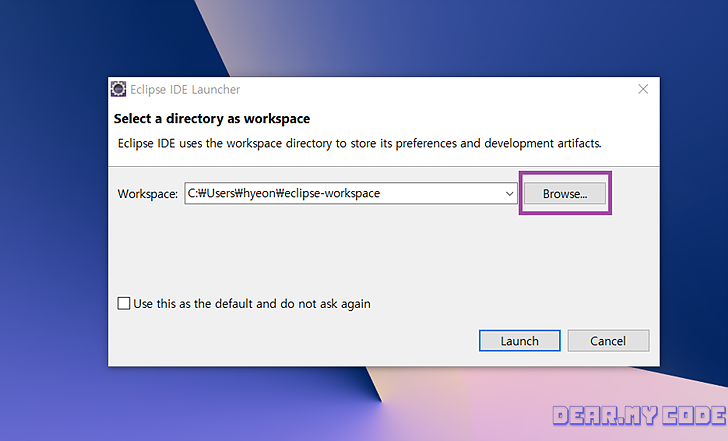 응용프로그램을 실행하면 이렇게 런처가 뜨고, workspace로 사용할 작업 영역 폴더를 지정해주어야 한다.