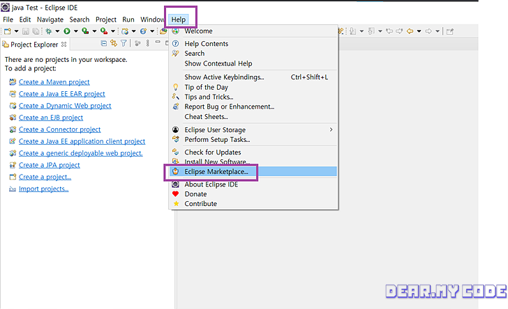 상단 메뉴바에서 맨 끝의 HELP 클릭 -> 그 후 하단의 Eclipse Marketplace를 눌러준다.
