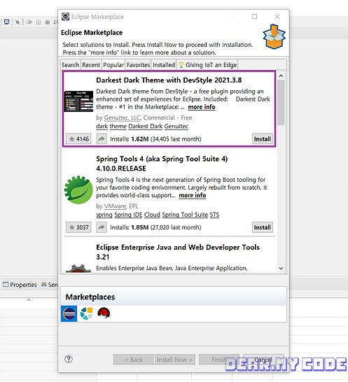 마켓플레이스 창이 뜨면 search탭에서 검색을 해도 좋고, popular 탭을 눌러보면 상단에