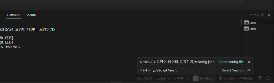 vscode에서 F1 키를 눌러 나오는 검색창에서 Typescript: Select Typescript Version을 검색하여 클릭하거나, vscode 하단의 TypeScript 쪽에 마우스를 가져다 대면 현재 버전이 4.9.4라고 나오고 옆에 select version을 눌러 버전을 바꿀 수 있다.
