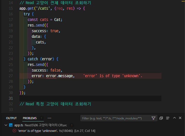 NestJS 강의를 듣던 중, try... catch... 문을 작성하는데 'error' is of type 'unknown'이라는 에러를 만났다.
